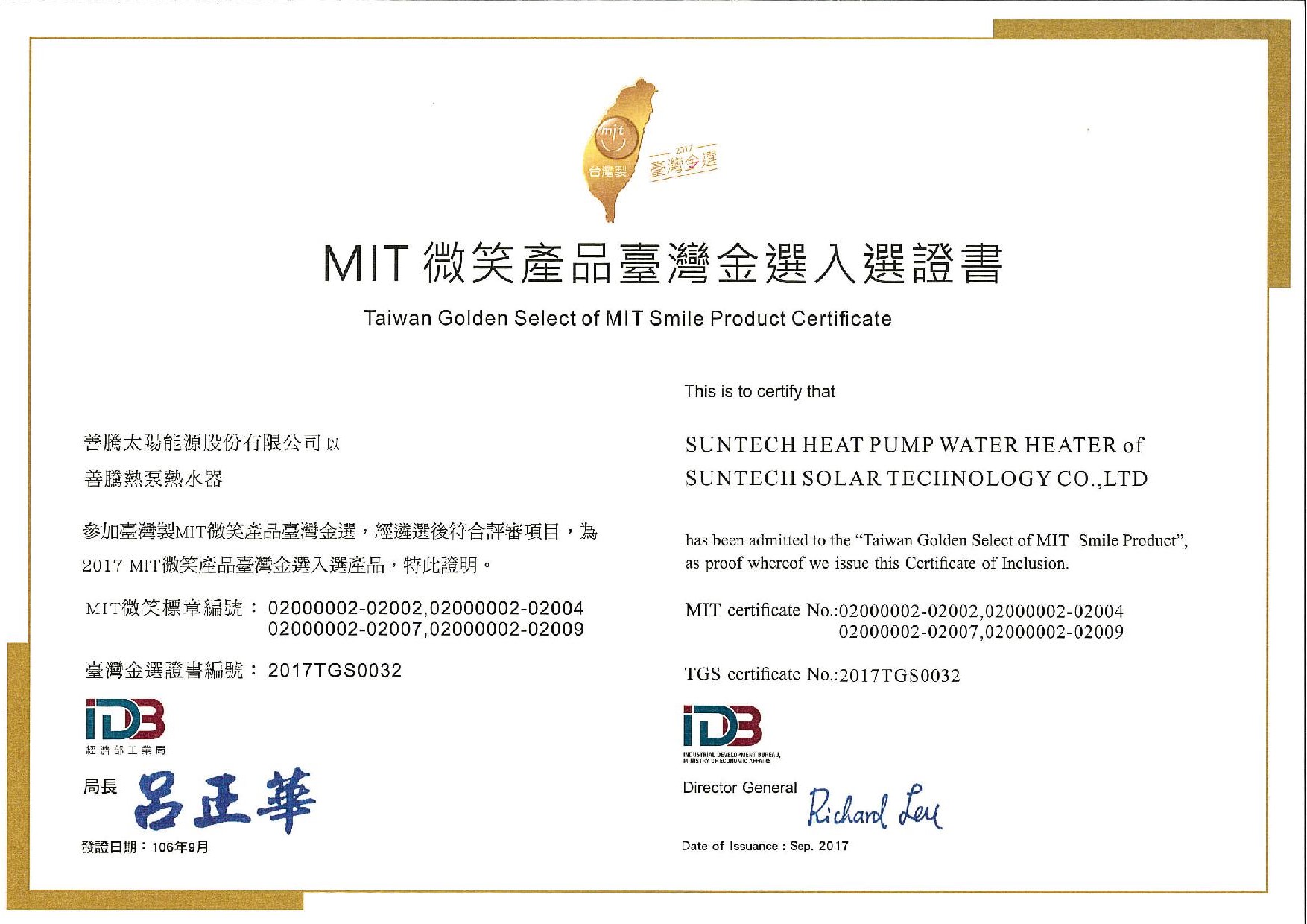 善騰全系列家用熱泵獲MIT微笑標章,也是同業中唯一取得此認證的廠商。善騰MIT微笑產品台灣金選入選證書恭喜!恭喜!