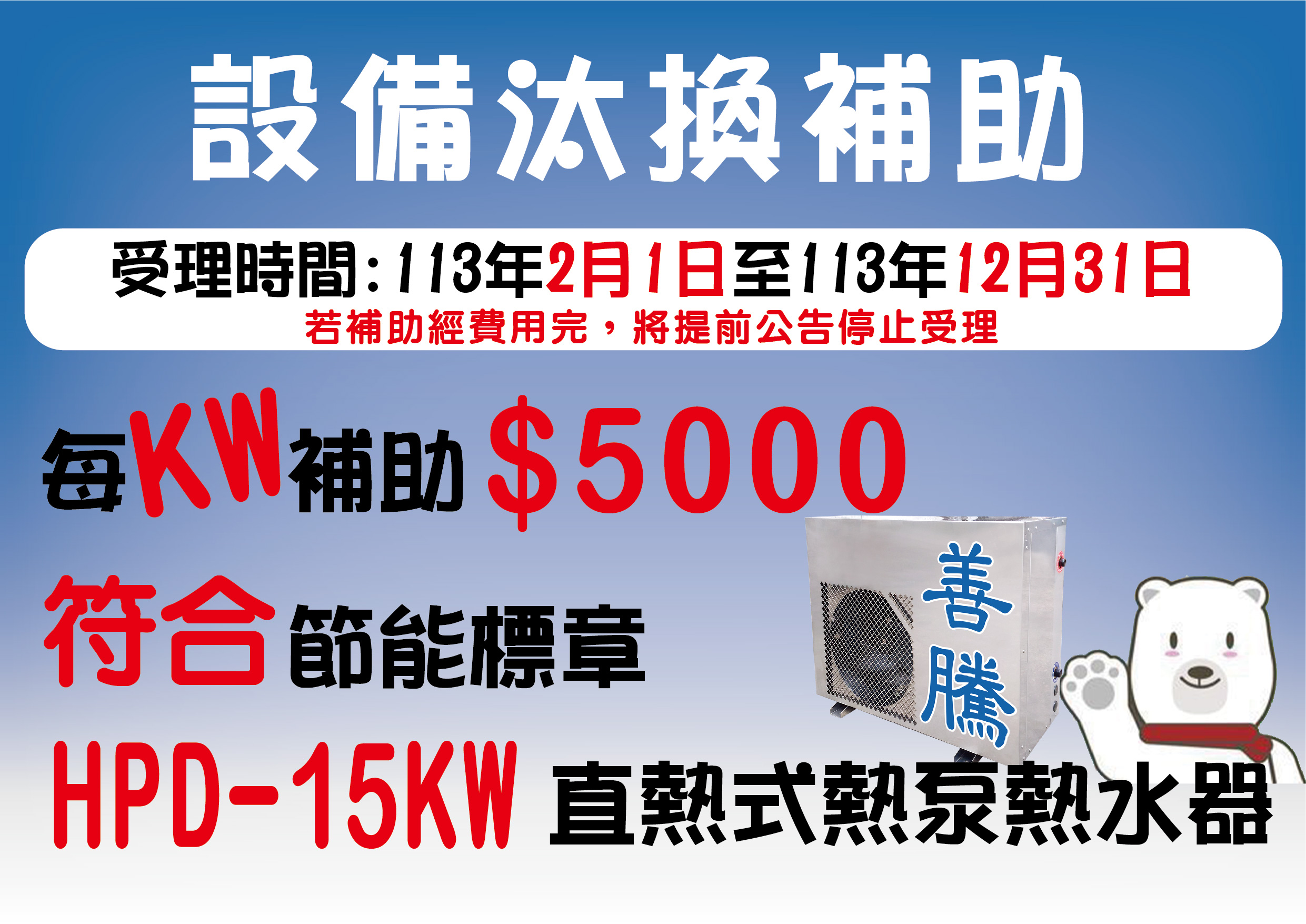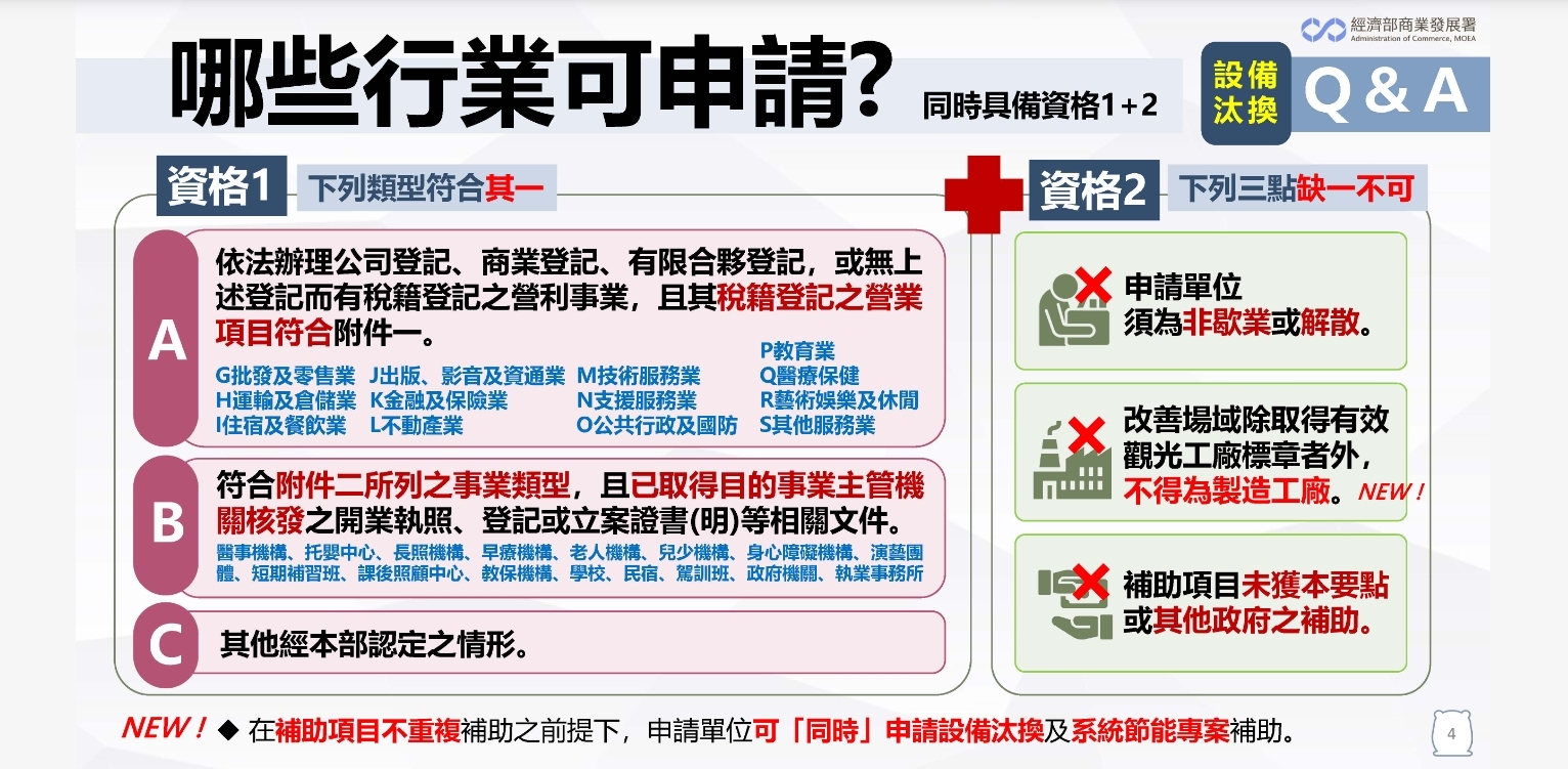 商業服務業節能設備補助開跑 申請期間:113年2月1日~113年12月31日 詳情請洽:https://www.essc.org.tw/subsidy/index/index.aspx