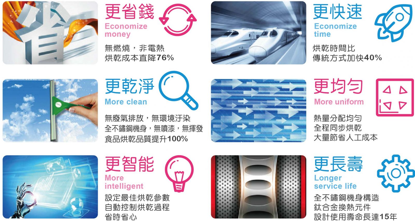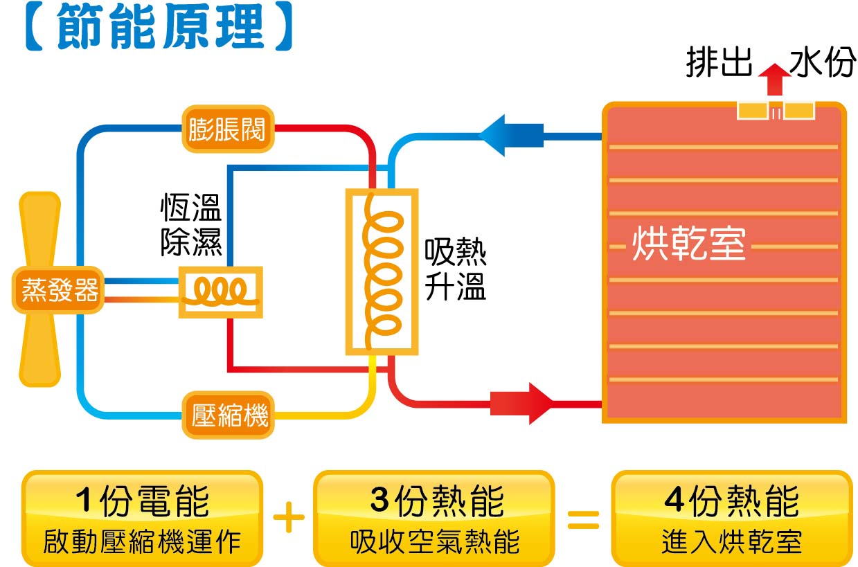 高效省電:本熱泵烘乾機組從空氣獲得大量的免費熱能,所消耗的電能僅僅是壓縮機用於搬運空氣、陽光能源時所需的能量。因此提供相同的烘乾量,它的用電量大幅降低,可為用戶省下大筆的用電費用。
